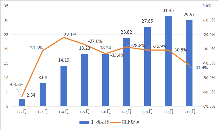 到10月结束时,利润总额不升反降,回落至29.97亿元,同比降幅扩大至41.4%。