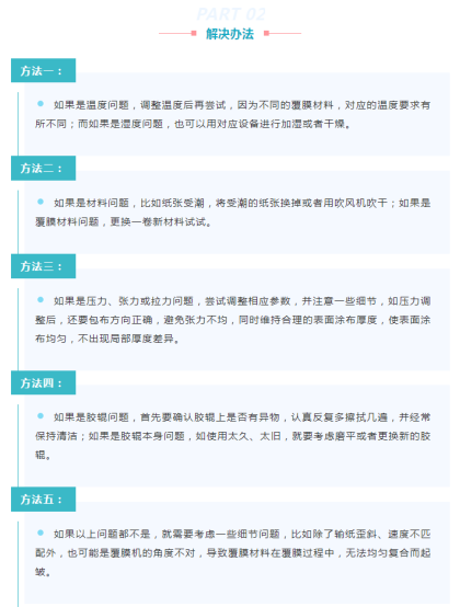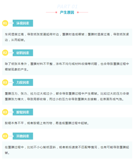 覆膜是指将涂布黏合剂后的塑料薄膜,与标签印刷品经加热、加压后黏合在一起,形成纸塑合一的标签产品,是印后加工工艺中最重要的工艺之一,是提高标签印品档次和商品价值的有效手段。然而,覆膜也并没有想象中的那么简单,一不小心就会出现问题,如覆膜褶皱等,本文,笔者将为大家详细分析一下标签覆膜褶皱产生的原因以及解决办法。
