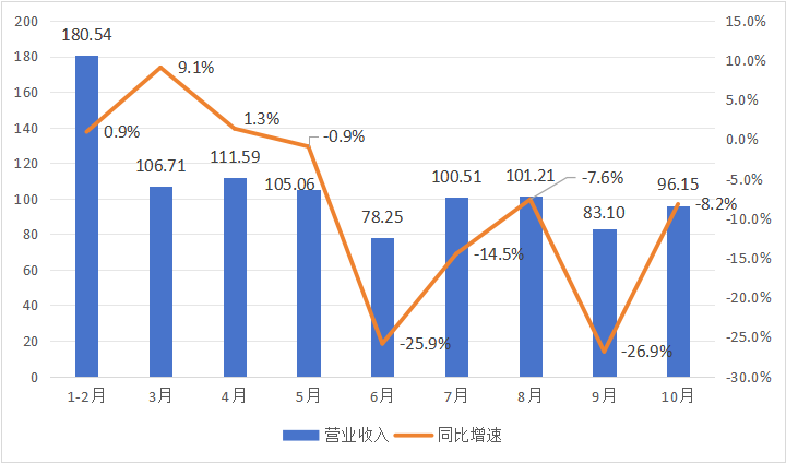 10月实现营收96.15亿元,比2024年同期低了8.60亿元,同比下降8.2%,自5月以来连续第6个月同比向下。