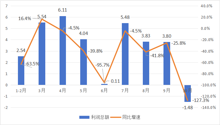 到10月结束时,利润总额不升反降,回落至29.97亿元,同比降幅扩大至41.4%。