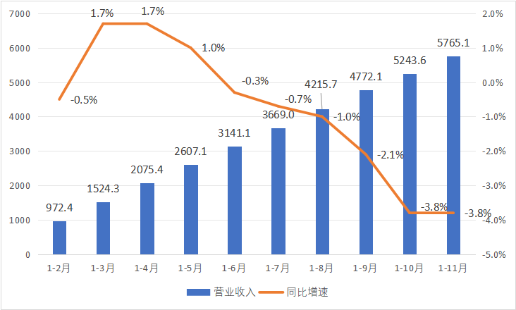 到10月结束时,营收达到5243.6亿元,同比下降3.8%;到11月结束时,达到5765.1亿元,同比降幅保持在3.8%。