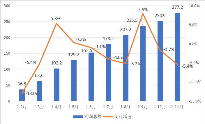 到10月结束时,利润总额达到250.9亿元,同比下降1.7%,未能延续增势;到11月结束时,达到277.2亿元,同比下降5.4%。