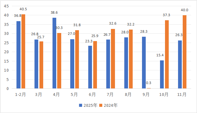 10月,实现利润总额15.4亿元,比2024年同期低了21.9亿元,同比下降58.71%;11月,实现利润总额26.3亿元,比2024年同期低了13.7亿元,同比下降34.25%。
